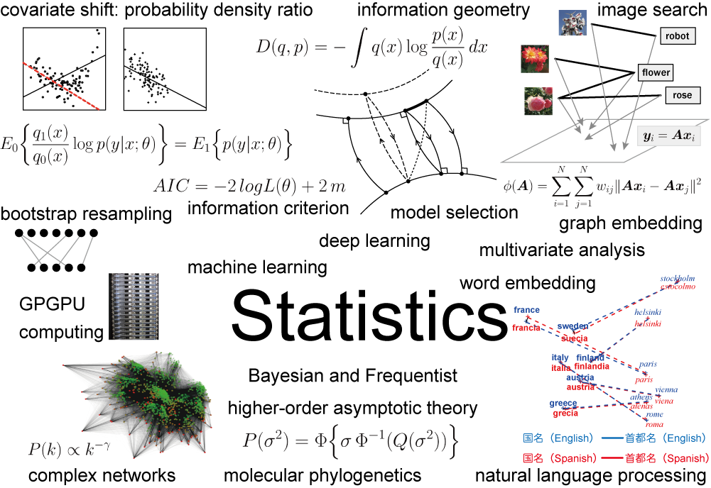 We work on the theory and applications of statistics and machine learning. Statistics is playing important roles as a theoretical framework for fast-moving fields such as big data, data mining, and artificial intelligence. Statistics provides methodologies for inductive inference from data with consideration of randomness. Large amount of data is now easily obtained via high-throughput systems, and machine learning methods, in particular, are growing rapidly. By facing real-world data, we are developing new statistical methods with emphasis on mathematics and programming skills.