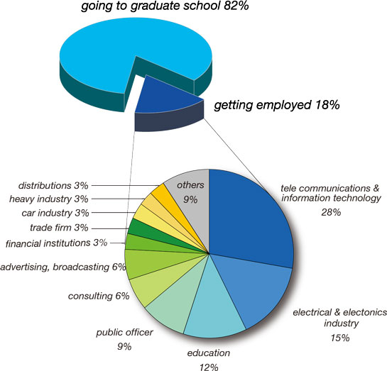 Because of the interdisciplinary nature of the Applied Mathematics and Physics, graduate students are hardly limited in selecting their place of employment. The Course annually produces excellent top-class personnel for various types of industry. It might be true that students of this Course have a greater leeway in selection of a place of employment.